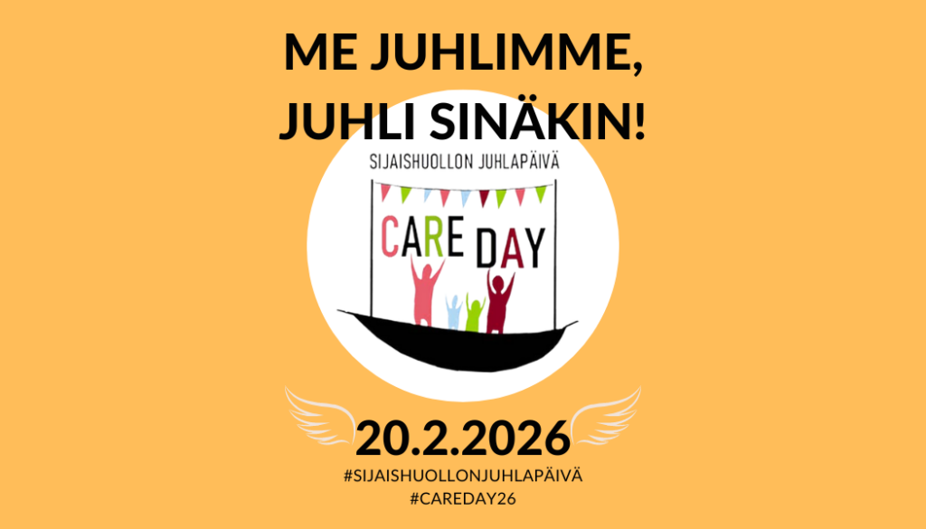 Sijaishuollon juhlapäivä Care Day’ta vietetään jälleen perjantaina 20.2.2026. Vuonna 2026 sijaishuollon juhlapäivä Care Day’n teemana on Unelmat kantavat, esteet kaatuvat, jonka inspiraationa toimii päivän kansainvälinen teema ”Esteitä rikkomassa” (Breaking Barriers). Voit lukea lisää teemasta joko juhlan omilta sivuilta tai aiemmasta uutisestamme.